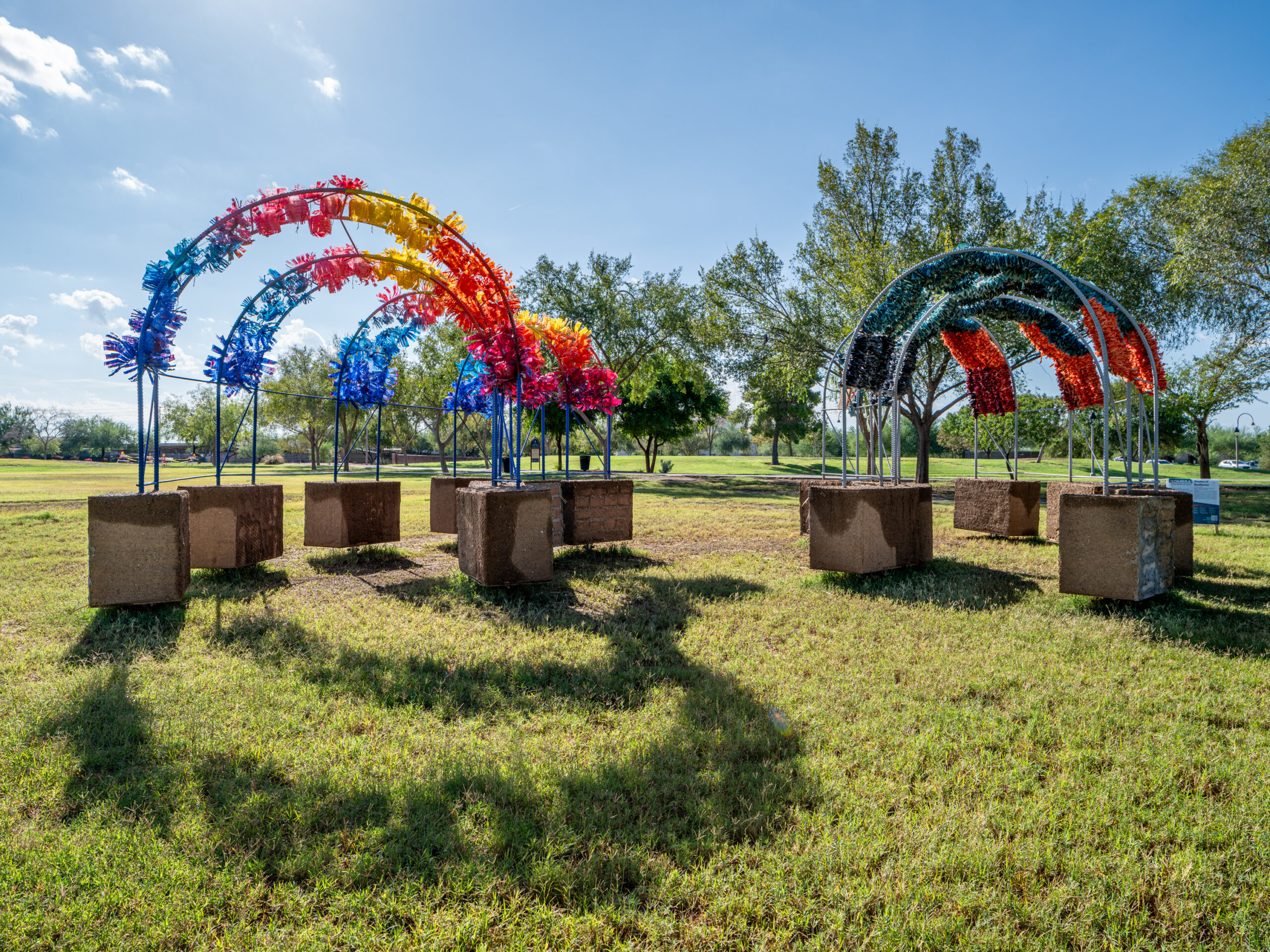 Discover Shades of Resilience, a transformative shade structure that celebrates the local Indigenous and Mexican American cultures. Part of ¡Sombra! Experiments in Shade, this installation offers heat relief education inspired by the wisdom of Indigenous ancestors and their ability to harness the utilitarian abundance of the desert. Uniting the community in a shared celebration of culture and sustainability, Shades of Resilience features words and symbols from Indigenous elders, intricate patterns inspired by native desert plants and blends new technologies with ancestral techniques to provide cooling, contemplative shade.